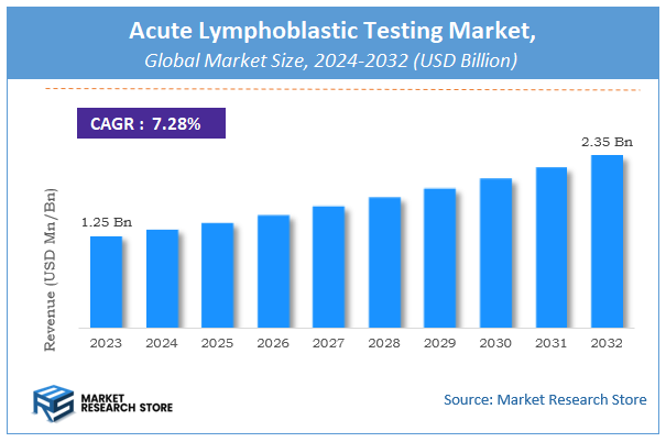 Market Research Store has released a new report on the Acute Lymphoblastic Leukemia (ALL) Testing Market. This report looks closely at how the market is growing, what's driving that growth, new trends, technology changes, challenges, and future opportunities. According to the report, the market was worth $1.25 billion in 2023 and is expected to grow to $2.35 billion by 2032. This means it's growing at a steady pace of 7.28% each year from 2024 to 2032.