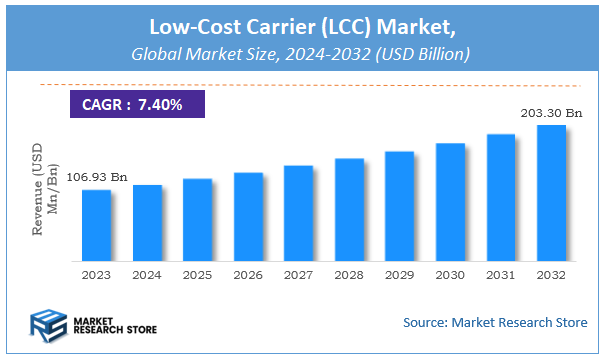 Market Research Store has published a new report on the global low-cost carrier (LCC) market, showing strong growth fueled by shifting consumer travel preferences and technological advancements. The market was valued at USD 106.93 billion in 2023 and is expected to reach USD 203.30 billion by 2032, growing at a CAGR of 7.4% during the forecast period 2024–2032. The report explores key market trends, innovations, challenges, opportunities, and future outlook in the LCC industry worldwide.