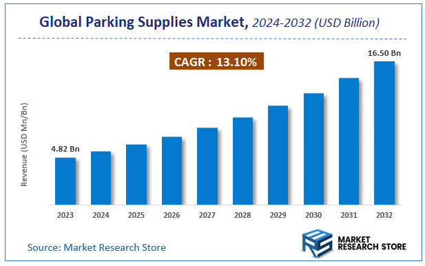 Global parking supplies market size was valued at around USD 4.82 billion in 2023 and is estimated to reach USD 16.50 billion by 2032, to register a CAGR of approximately 13.1% in terms of revenue during the forecast period 2024-2032.