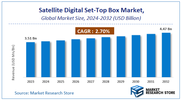 Market Research Store has released a new report on the global satellite digital set-top box (STB) market, projecting steady growth driven by rising demand for satellite TV in areas with limited terrestrial access and enhanced feature integration. The satellite digital set-top box market was valued at USD 3.51 billion in 2023 and is expected to reach USD 4.47 billion by 2032, growing at a CAGR of 2.7% during the forecast period 2024–2032. The report explores key trends, technology developments, regional demand shifts, and future opportunities shaping the satellite STB industry.