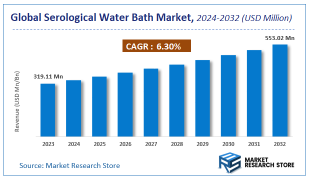 Market Research Store has released a new report on the global serological water bath market, highlighting steady growth driven by medical advancements and changing laboratory needs. The market was valued at USD 319.11 million in 2023 and is projected to reach USD 553.02 million by 2032, growing at a CAGR of 6.3% during the forecast period 2024-2032. The report covers key trends, innovations, challenges, opportunities, and the future outlook of the laboratory equipment industry.