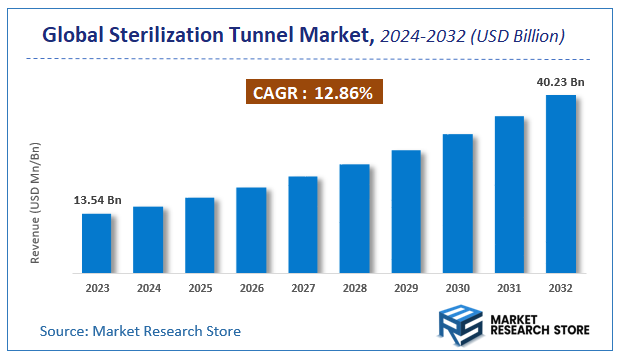 The global Sterilization Tunnel Market is projected to reach a substantial value of USD 40.23 billion by 2032, growing at a robust Compound Annual Growth Rate (CAGR) of 12.86% from its 2023 value of USD 13.54 billion. Market Research Store, a leading market research and analysis firm, has published its in-depth research report on the global Sterilization Tunnel Market. The comprehensive study provides a detailed analysis of the current market landscape, growth drivers, emerging trends, challenges, and future opportunities. This meticulously crafted report offers stakeholders a step-by-step guide to understanding the intricacies of the sterilization tunnel market, providing crucial insights for strategic decision-making, investment planning, and business expansion.