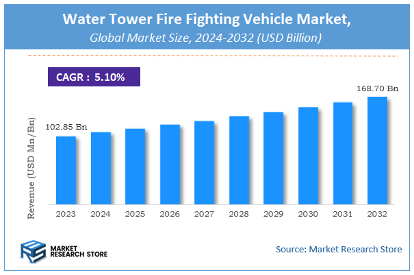 Market Research Store has published a new report on the global "Water Tower Fire Fighting Vehicle Market," which reveals robust growth prospects for this crucial sector. The water tower fire fighting vehicle market is projected to witness an impressive increase from USD 102.85 billion in 2023 to an estimated USD 168.70 billion by 2032. This significant expansion is anticipated at a Compound Annual Growth Rate (CAGR) of 5.1% over the forecast period from 2024 to 2032. This comprehensive market research report offers an in-depth analysis of market dynamics, key trends, competitive landscape, and future opportunities within this critical sector.