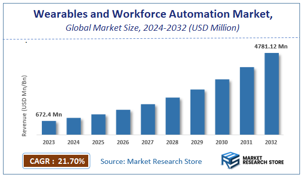 Market Research Store has published a new report on the global "Wearables and Workforce Automation Market," which reveals an extraordinary growth trajectory for this transformative technology sector. The wearables and workforce automation market is projected to witness a massive increase from USD 672.4 million in 2023 to an estimated USD 4,781.12 million by 2032. This explosive expansion is anticipated at a remarkable Compound Annual Growth Rate (CAGR) of 21.7% over the forecast period from 2024 to 2032. This comprehensive market research report offers an in-depth analysis of market dynamics, key trends, competitive landscape, and future opportunities within this critical sector.